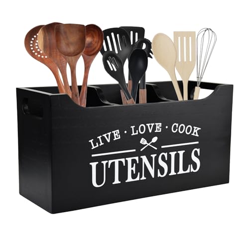 Karisky Köksredskapshållare med avtagbar botten, stora 3 fack massivt äkta träredskap, organisatör, bondgård matlagningsverktyg hållare för bänkdekor