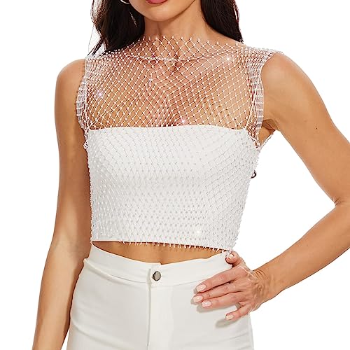 JasGood Strass glänsande nätkropp kedja toppar för kvinnor gnistrande bikini crop top för nattklubb party festival, Vit ärmlös, En Storlek