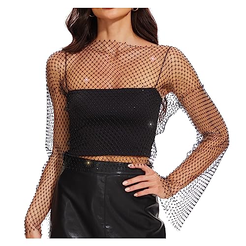 JasGood Strass glänsande nätkropp kedja toppar för kvinnor gnistrande bikini crop top för nattklubb party festival, Svart lång ärm, En Storlek