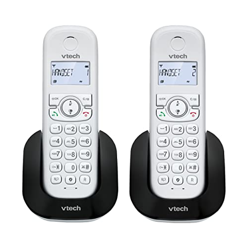 VTech CS1501 Trådlös telefon för hemmet duo, DECT med dubbel laddning, extra stark fast telefon, handsfree, lås och nummerpresentation, bakgrundsbelyst skärm och tangentbord, vit