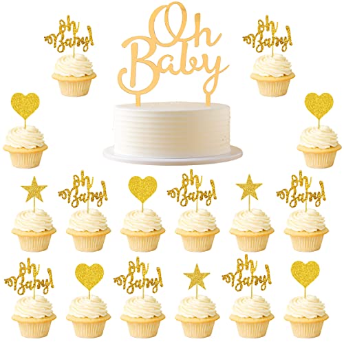 Kawailay 33 stycken glitter Åh baby cupcake toppers guld baby shower tårtdekoration med hjärta och stjärna akryl Åh baby tårtdekoration för baby shower barn pojke flicka födelsedag dekor