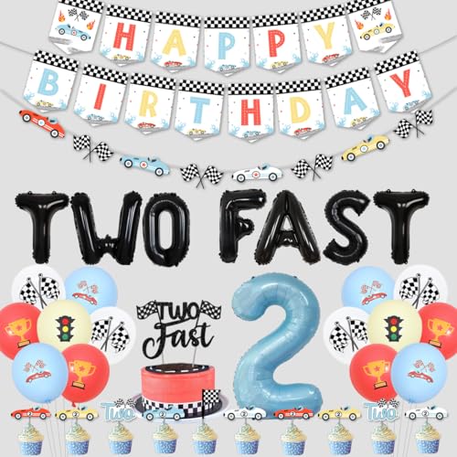 Vintage 2:a födelsedagsdekorationer, racerbil banderoll för pojke, krans, cupcake-toppers, pastellballonger