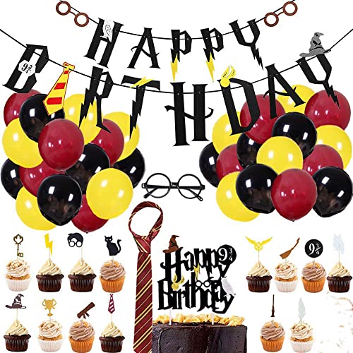 TANSHOP Magic Wizard Birthday Party Supplies för barn Wizard temafest dekorationer med Happy Birthday-banner, randig slips nyhet glas ram cupcake-toppers ballonger