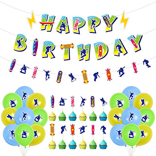 JeVenis skateboard födelsedag dekoration skateboard tema banderoll skateboard födelsedagstillbehör siluett ballonger skate tårtdekoration skejtare cupcake toppers