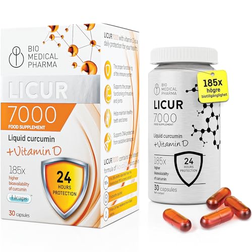 Gurkmeja kapslar med vitamin D3 – 185 x högre biotillgänglighet – högdoserad miceller curcumin – 1 kapsel dagligen – motsvarar 6600 mg curcuma pulver – Licur 7000 med vitamin D (månadspack)