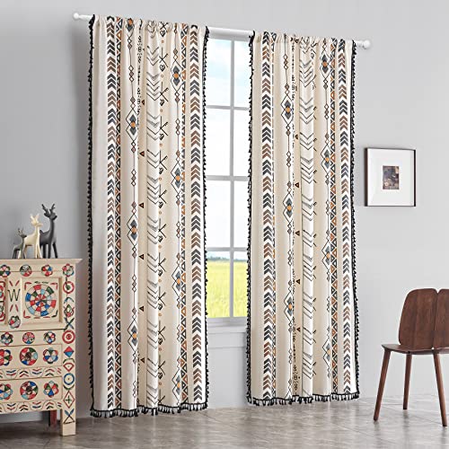 Boho Curtains Bohemian Window Curtains with Black Tassel Fringe Cotton Drapery for Living Rooms & Bay Windows Light-Filtering Farmhouse Curtain, Rod Pocket, 59x84 Inches, 1 Panel