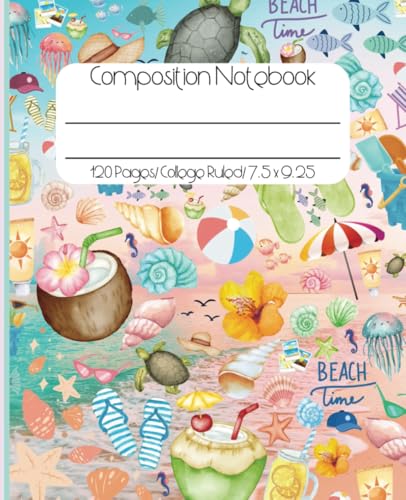 Cute Beach Composition Notebook. For teens students and adults. College Ruled, 120 pages, 7.5 x 9.25in, matte cover turtles, seashells, fish etc.