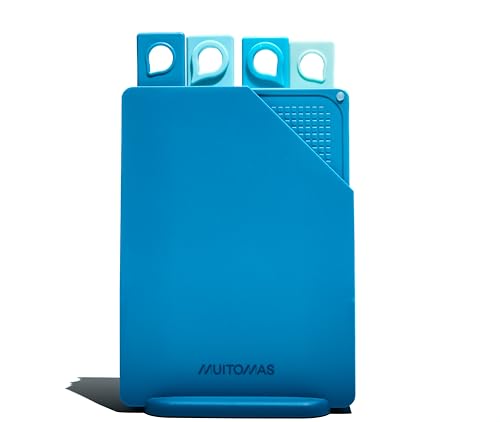 Muitomas, Färgade skärbrädor i hårdplast för kök, med halkfria gummiband och tunn utrymmesbesparande behållare, 20,5 x 14,5 cm, ottaniumblå