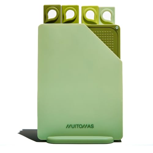 Muitomas, Färgade skärbrädor i hårdplast för kök, med halkfria gummiband och tunn utrymmesbesparande behållare, 20,5 x 14,5 cm, salviagrön