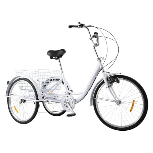 ROGONPDK trehjuling för 26 tum vuxna, 3 hjul 6 växlar vuxen cykel vit trehjuling seniorer cykel seniorer cykel med korg fars dag gåva för pappa