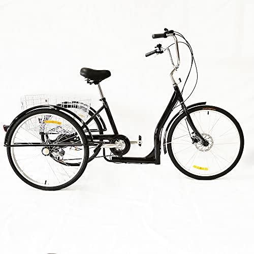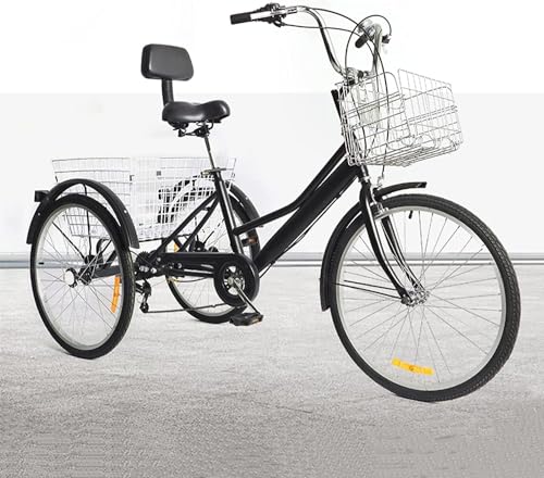 VonVVer 24 tums trehjulingar vuxna med 2 korgar – 7-växlad trehjuling för vuxna 120 kg belastning justerbar 3 hjul cykel stadscyklar Cruise shoppingcykel för äldre kvinnor äldre (svart)