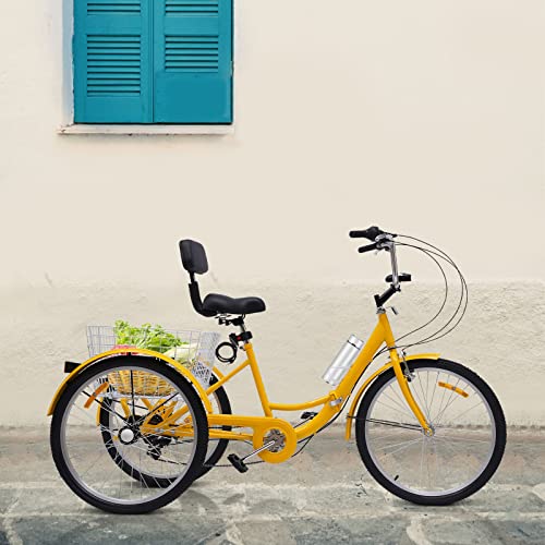 WSIKGHU 24 tums trehjuling för vuxna vikbar vuxna trehjuling 7 växlar trehjuling cyklar av kolstål med LED-ljus och korg 3 hjul cykel för vuxna från 160–185 cm, max 140 kg (gul)