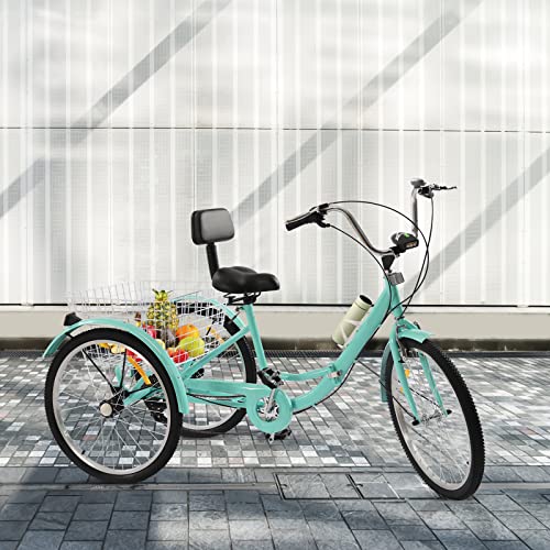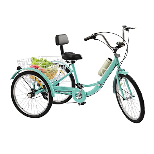 AOAPUMM vikbar trehjuling för vuxna 24 tums cykel 3-hjul 7-växlad med shoppingkorg trehjuling för vuxna, seniorer, kvinnor (ljusgrön)