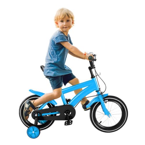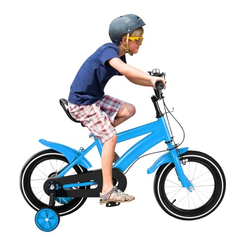 UESUENYENS 14 tums barncykel, pojkar, cykel, flickcykel, unisex, 3–6 år, balanscykel med stödhjul, en kombination av fram- och bakhjulsbroms (blå)