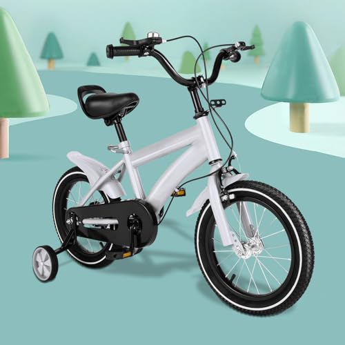 UESUENYENS 14 tums barncykel, pojkar, cykel, flickcykel, unisex, 3–6 års balanscykel med stödhjul, en kombination av fram- och bakhjulsbroms (vit)