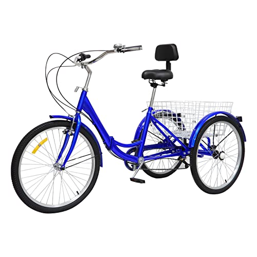 RibasuBB trehjuling för vuxna, 24 tum, 7 växlar, 3-hjuls-seniorcykel med korg, trehjulig cruiser-cykel för rekreation, shopping och picknick, blå