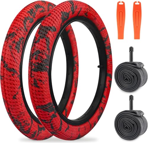 ZUKKA 2-pack 30TPI cykeldäck 16 tums däck 16 x 2,10 kappa 56–305 Plus 2-pack 16 tums slang 16 x 1,75/2.125 AV35 mm för barncykel, MTB, mountainbike, BMX, röd svart