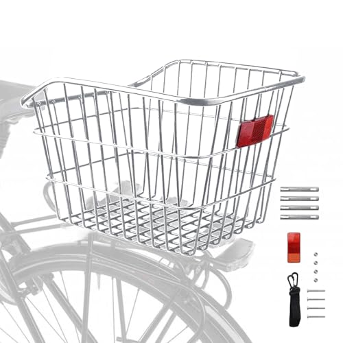 Cykelkorg bak, cykelkorg bak metall förstärkta kanter skolväska cykelkorgar med monteringstillbehör och reflektor, silver/svart
