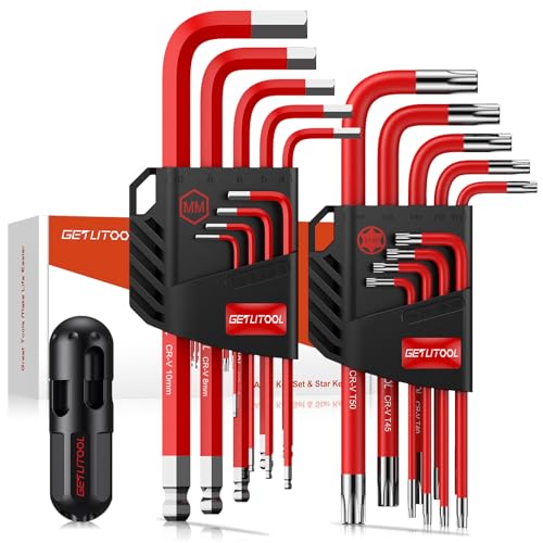 GETLITOOL Set med 18 st insexnyckel, Cr-V metrisk insexnyckelsats med T-handtag, sexkantsnyckel och stjärnnyckel 1,5 mm-10 mm & T10-T50 med storleksmärkt och förvaringsfäste för cykelreparation