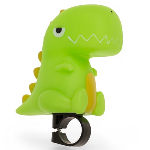 MIJOMA Cykeltuta Dinosaurie för barn – rolig plastcykelklocka – grön – 11,5 cm – Dino Hupe för styre – säkerhetstillbehör för barncyklar