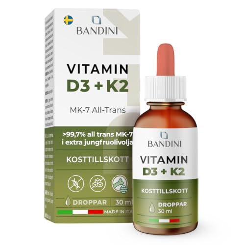 Bandini® Vitamin D3 K2 Droppar, i extra jungfruolivolja EVO, Vitaminer D Cholecalciferol 1000 IE per droppe + Vit K MK-7 Menaquinone Kappa 99,7% 100 mcg per droppe, med praktisk droppare