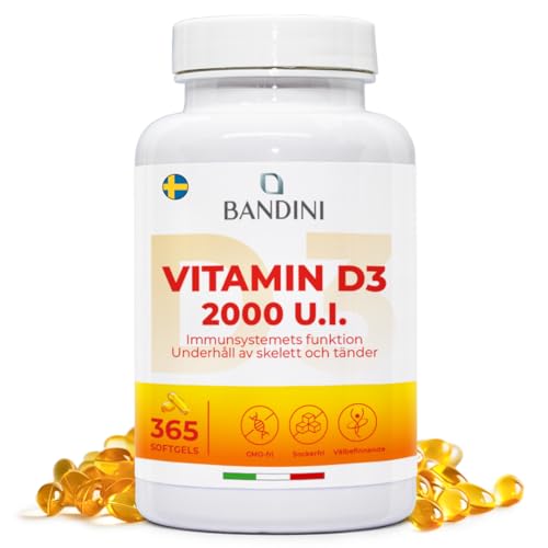 Bandini® Vitamin D3 2000 IE 365 softgels (i 1 år), hög dos 50 μg, D-vitamin kolekalciferolpärlor, i extra jungfruolivolja för optimalt upptag, ben, tänder, muskler, immunsystem