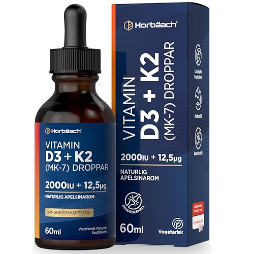 Vitamin D3 K2 Drops på 60 ml | 2000 IE D3 + 12,5 mcg K2 MK7 | Vitamin D3 K2 Droppar Högt Doserat | Horbaach