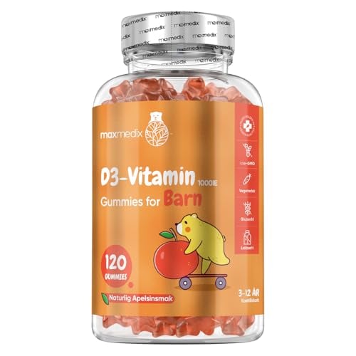 Vitamin D3 gummibjörnar för barn - För ben, immunförsvar och tänder (EFSA) - 1000IE vitamin D3 som kolekalciferol - 120 apelsingummin - 1 gummi en dag - Alternativ till droppar - maxmedix