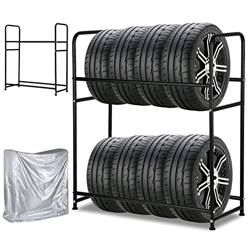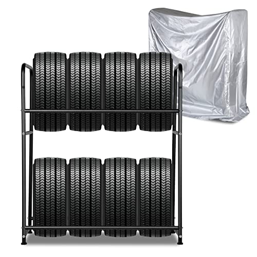 Vkechh 1 x däckhylla för 8 däck, 107 x 46 x 117 cm däckställ 2 lager höjdjustering, förvaringshyllor lastkapacitet 180 kg med däckskydd för garage källare verkstad