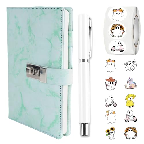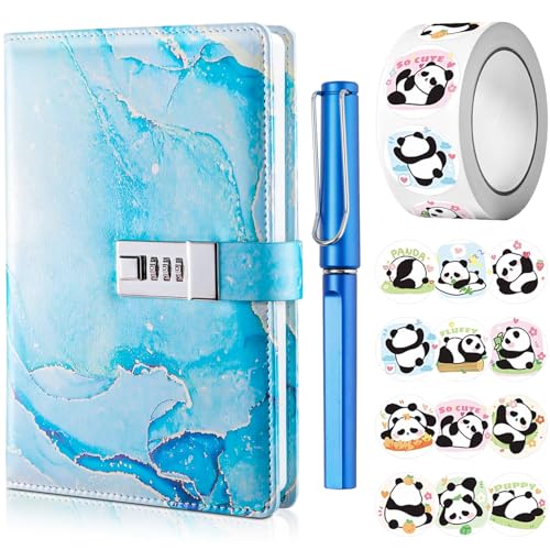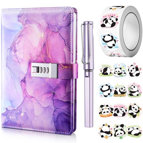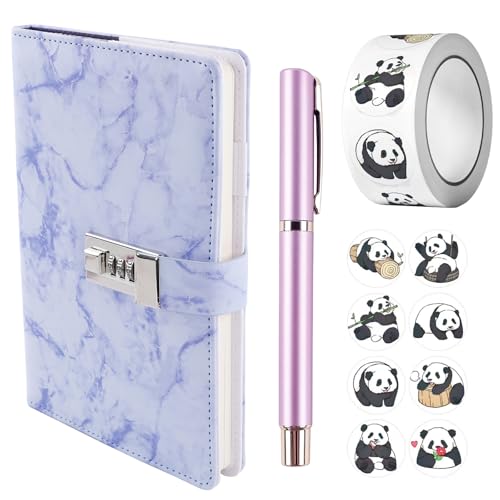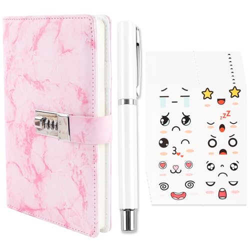 UNIANE Dagbok med lås för flickor, A5-dagbok med kod, anteckningsbok med lås med penna och roligt klistermärkesset, PU-läder anteckningsbok, hemlig marmor anteckningsböcker för födelsedag present (22