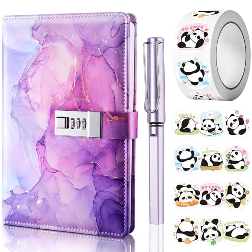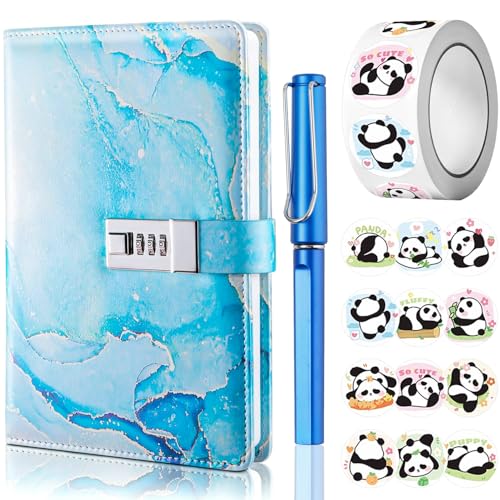 UNIANE Dagbok med lås för flickor, A5-dagbok med kod, anteckningsbok med lås med penna och roligt klistermärkesset, PU-läder anteckningsbok, hemlig marmor anteckningsböcker för födelsedag present (22