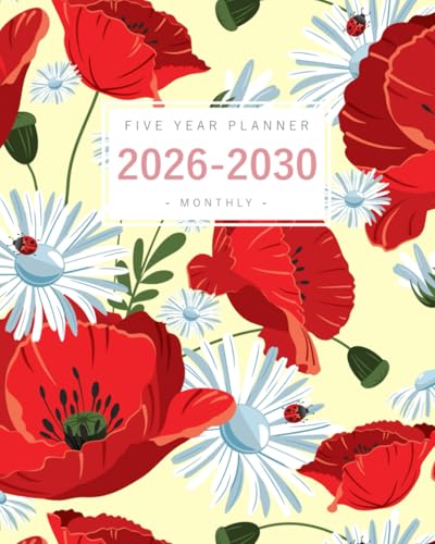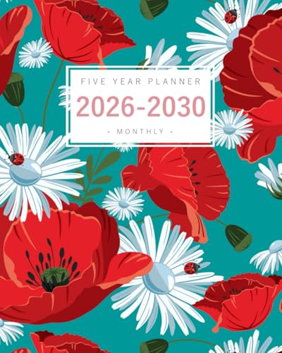 Five Year Planner 2026-2030: 8x10 Monthly Notebook Organizer Large | Bright Poppy Daisy Flower Design Teal
