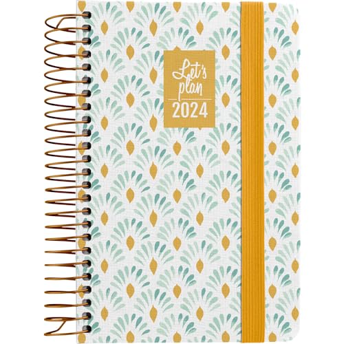 Grafoplás | Liten agenda 2024 | Spanska | A6 | Daisy Design | 10,5 x 14,9 cm | Med spiral | Inbundet fodrat hårt omslag i tryckt tyg | Elastisk stängning | Perfekt för att hantera din tid