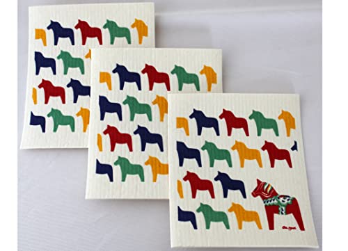 Design 20+ Svenska Disktrasor 3-pack Svenskdesignad Skurduk som är Klimatsmart Hållbar Biologiskt Nedbrytbara och Återanvändbar Superabsorberande Rengöringsduk för Kök Tvättstuga Garaget (Dalahäst vit 3-pack)