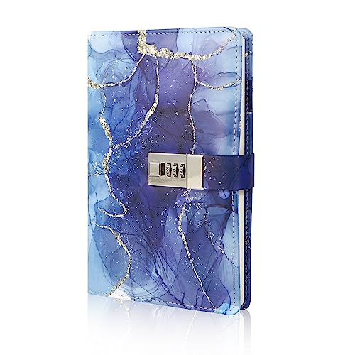 LMTNNB Marmordagbok med lås för flickor och kvinnor, A5 läderlåst dagbok för tonårstjejer, hemlig söt lösenordslås, anteckningsböcker med pennhållare för resedagbok, kontor, anteckningsblock