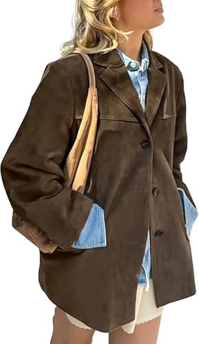 Dam vintage fuskmocka blazerjacka, tandad enkelknäppt fuskmocka läder kostym jacka brun mocka jacka (brun, L)
