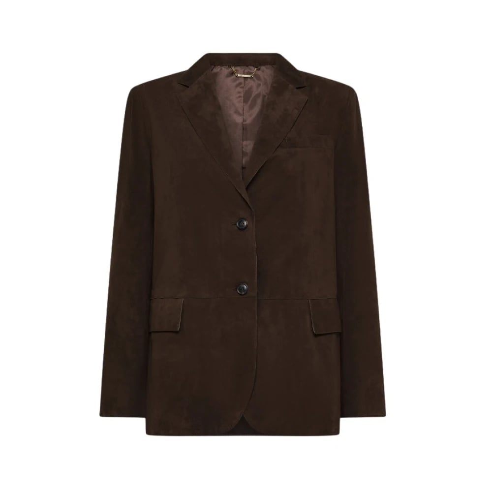 A&M Express mörkbrun mocka läder blazer jacka – lös elegant kappa med fickor för kvinnor, Mörkbrunt, S