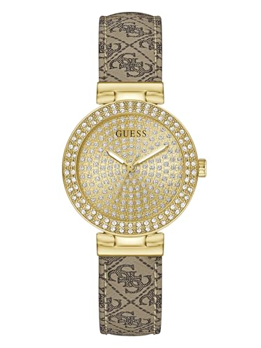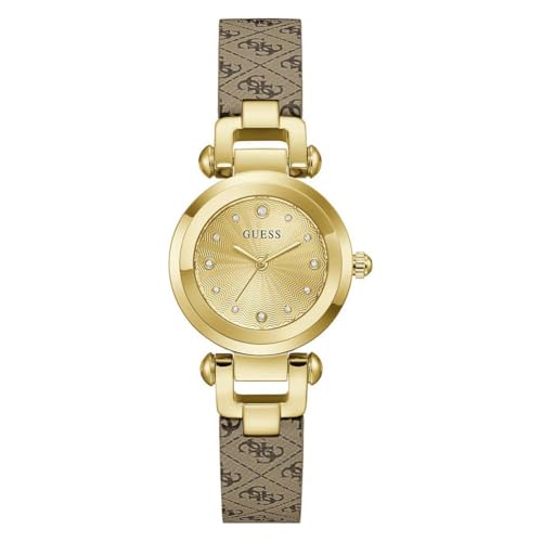 Guess damarmbandsur GW1021L2, 30 mm rostfritt stål guld, guldfärgad urtavla med stentrimning, kvarts, mineralglas, härdad, 3 ATM, läderarmband brunt