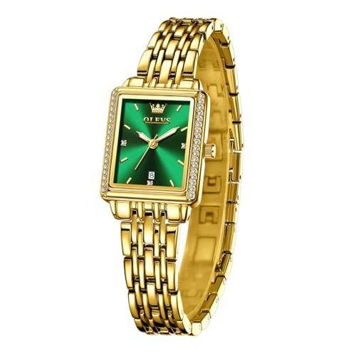 OLEVS Guld damklocka, rektangulär rostfritt stål analog kvarts damklocka, klassisk lyxig klänning diamant med datum armbandsur damer, A2-grön urtavla/guldarmband, Standard, Armband