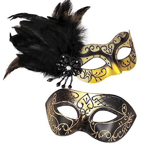 MYSEUNI Glod maskeradmask för par – dammask med fjädrar och venetianska masker för män – fest, Mardi Gras, halloween, cosplay, bal, jul