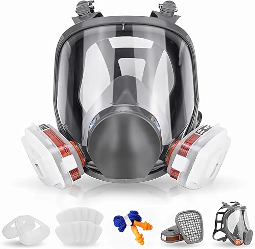 Återanvändbar helansiktsmask andningsmask, gasmask, helansiktsmask med filter, industriell dammskyddsmask för sprutning, slipning, målning, polering, svetsning med 22 filtrerbara, öronproppar