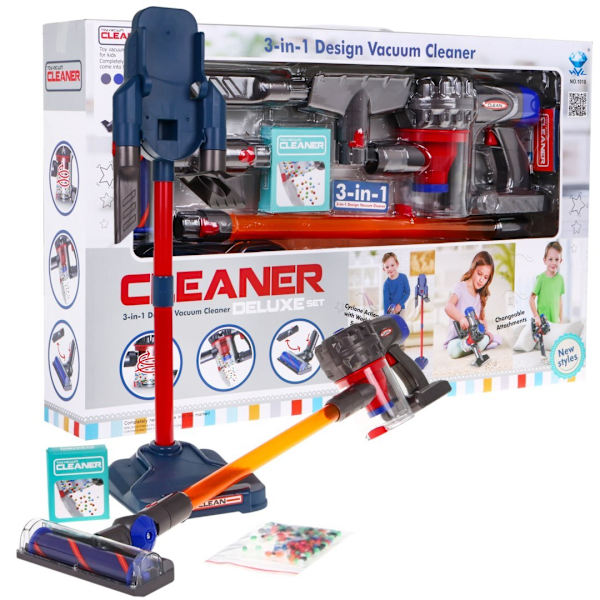 3-i-1 rengöringsset för hushållsapparater för barn: handhållen upprättstående dammsugare + borstar + dockningsstation