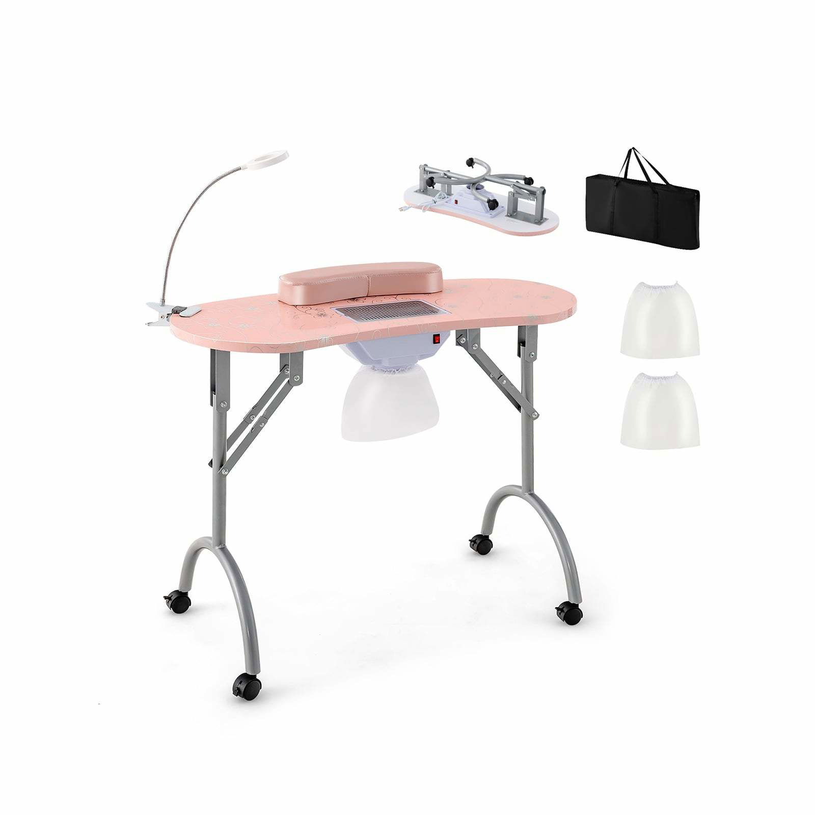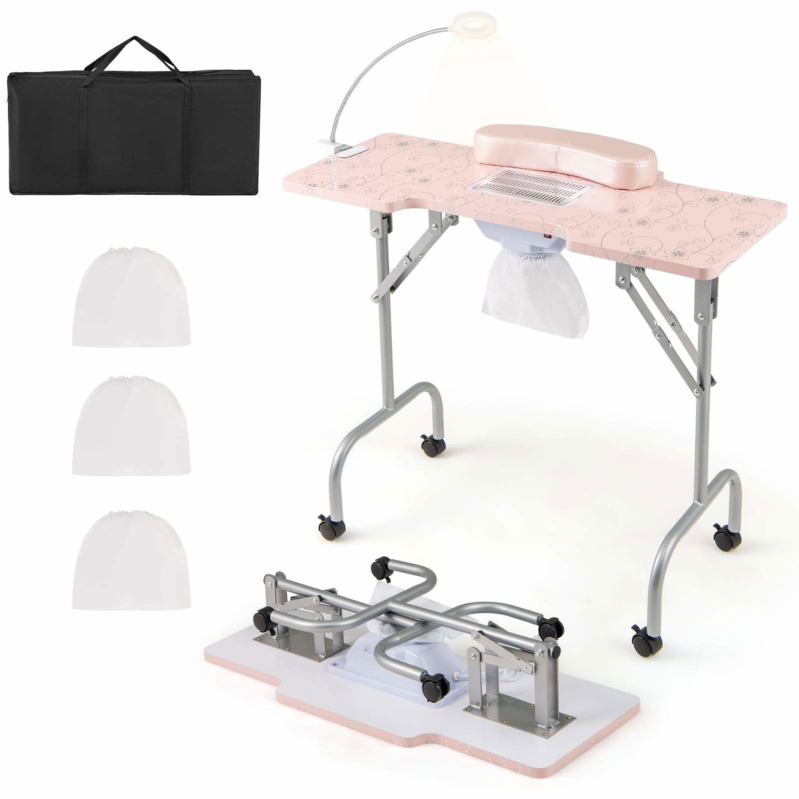 COSTWAY manikyrbord, vikbart, nagelbord med elektrisk dammuppsamlare, LED-lampa, handledsstöd, bärväska och rullar, manikyrbord marmorutseende (rosa)
