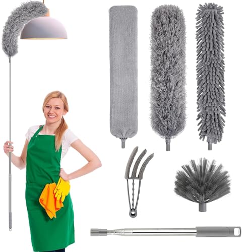 LAPony Dammvippa teleskop tvättbar set med 7 stycken utdragbar dammborste chenille fjäder duster mikrofiber dammmopp spindelvävkvast med teleskophandtag hörnkvast för rengöring hörn tar bort damm