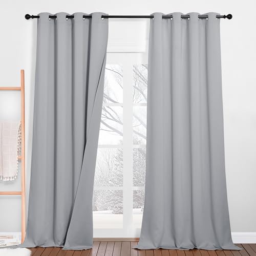 Pony Dance Tre lager ljusbeständiga gardiner med öljetter gardiner set om 2 stycken H 260 x B 132 cm 100 % mörkläggningsgardin termisk gardin mot kyla ljudisolering gardin med filtfoder, silvergrå