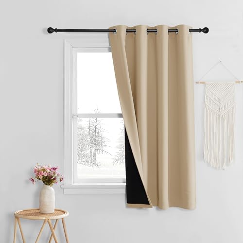 Pony Dance Korta gardiner beige ogenomskinlig öljettskynke set om 1 st H 160 x B 140 cm 100 % mörkläggningsgardin med svart foder tjock gardin värmeskydd termisk gardin, ljusbeige