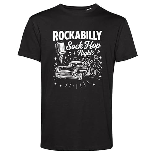 Rockabilly Sock Hop Nights T-shirt – Retro 50-talstryck med bilar, dans och musik | Svart bomullströja för män | Vintagestil för rock'n'roll-fans och klassiska bilevenemang