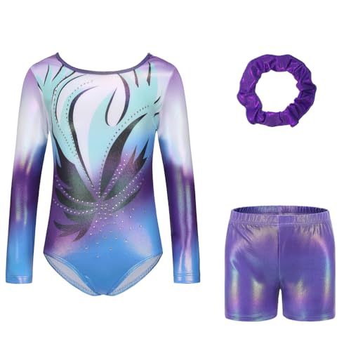 FEESHOW Barn flickor dansdräkt glitter metallisk skjorta kjol shorts set glänsande crop tank topp skater kjol karneval party danskläder, Lila_A, 122-128