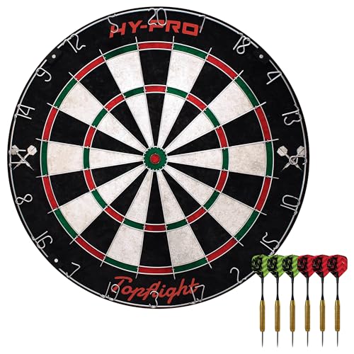 Hy-Pro Topflight Dartset med professionella dartpilar med sisalyta, Bullseye, utan häftklamrar, rörlig tråd, 6 dartpilar med 18 g stålspets, monteringssats för väggmontering, inomhus och