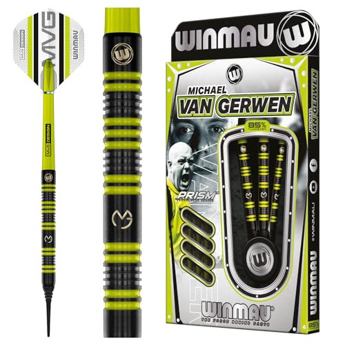 WINMAU Darts – MvG 85% Pro-serien 18 g tunna/20 g full vikt mjuk spets dartset med dartflygningar och dartaxlar (stammar)